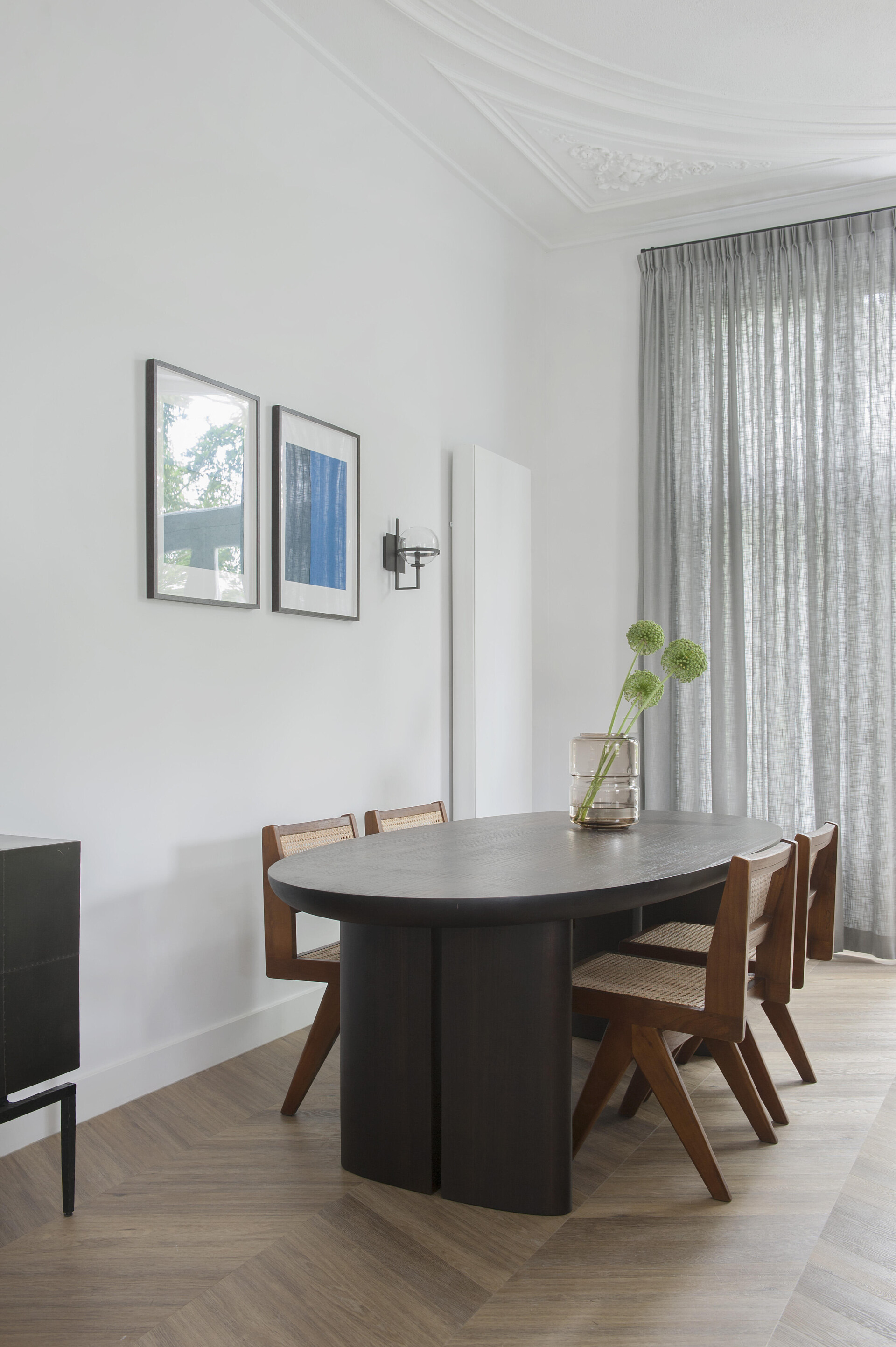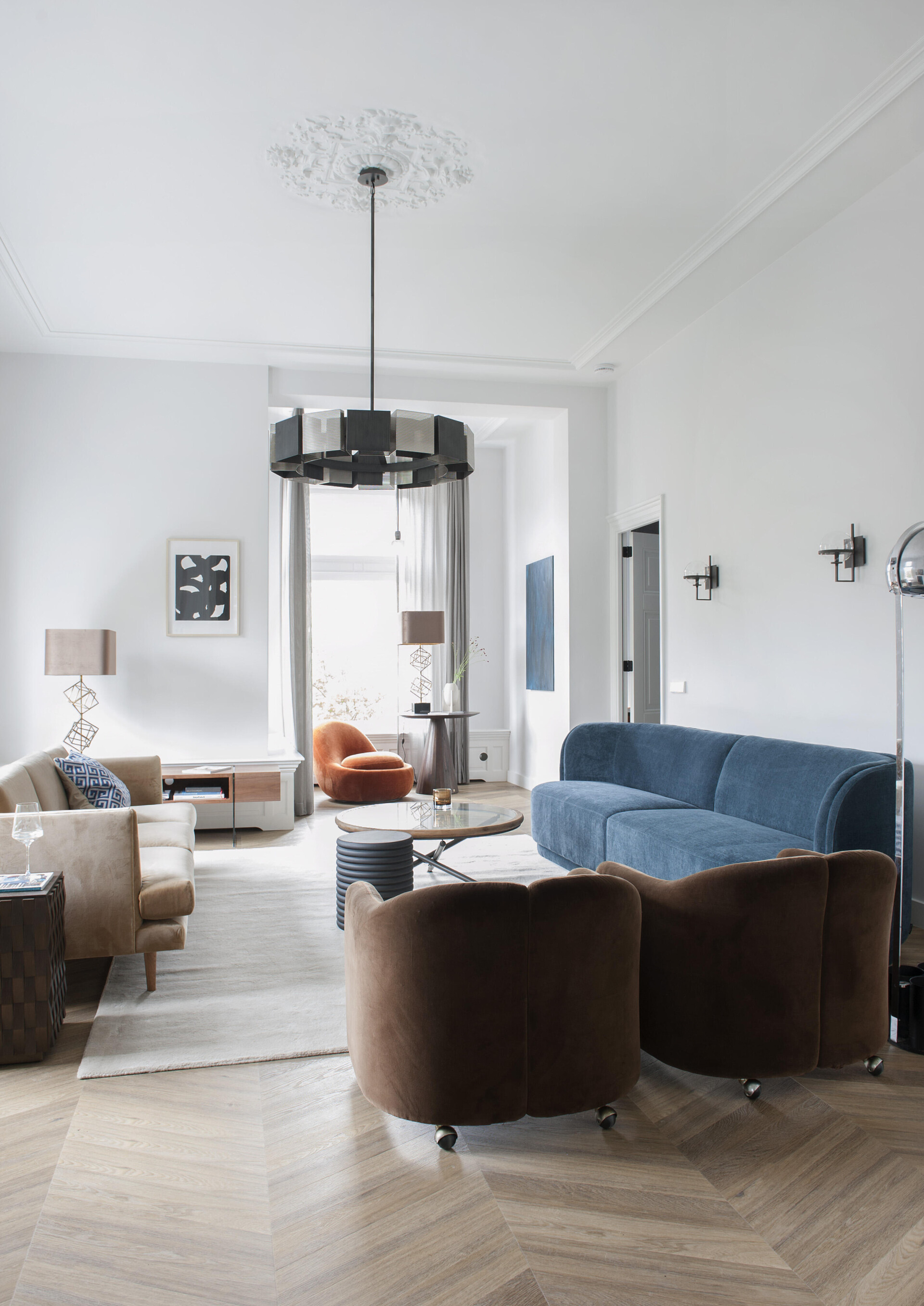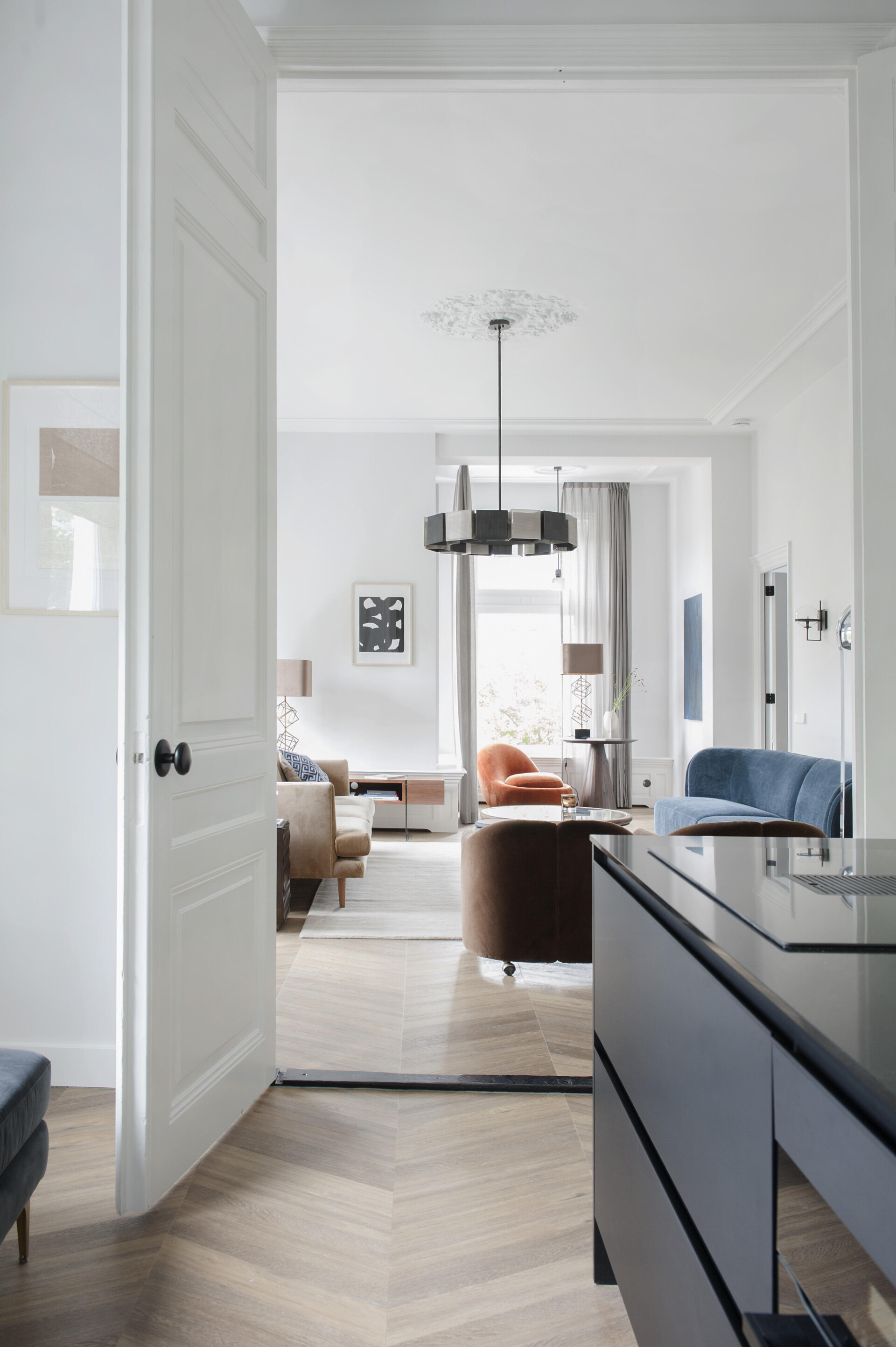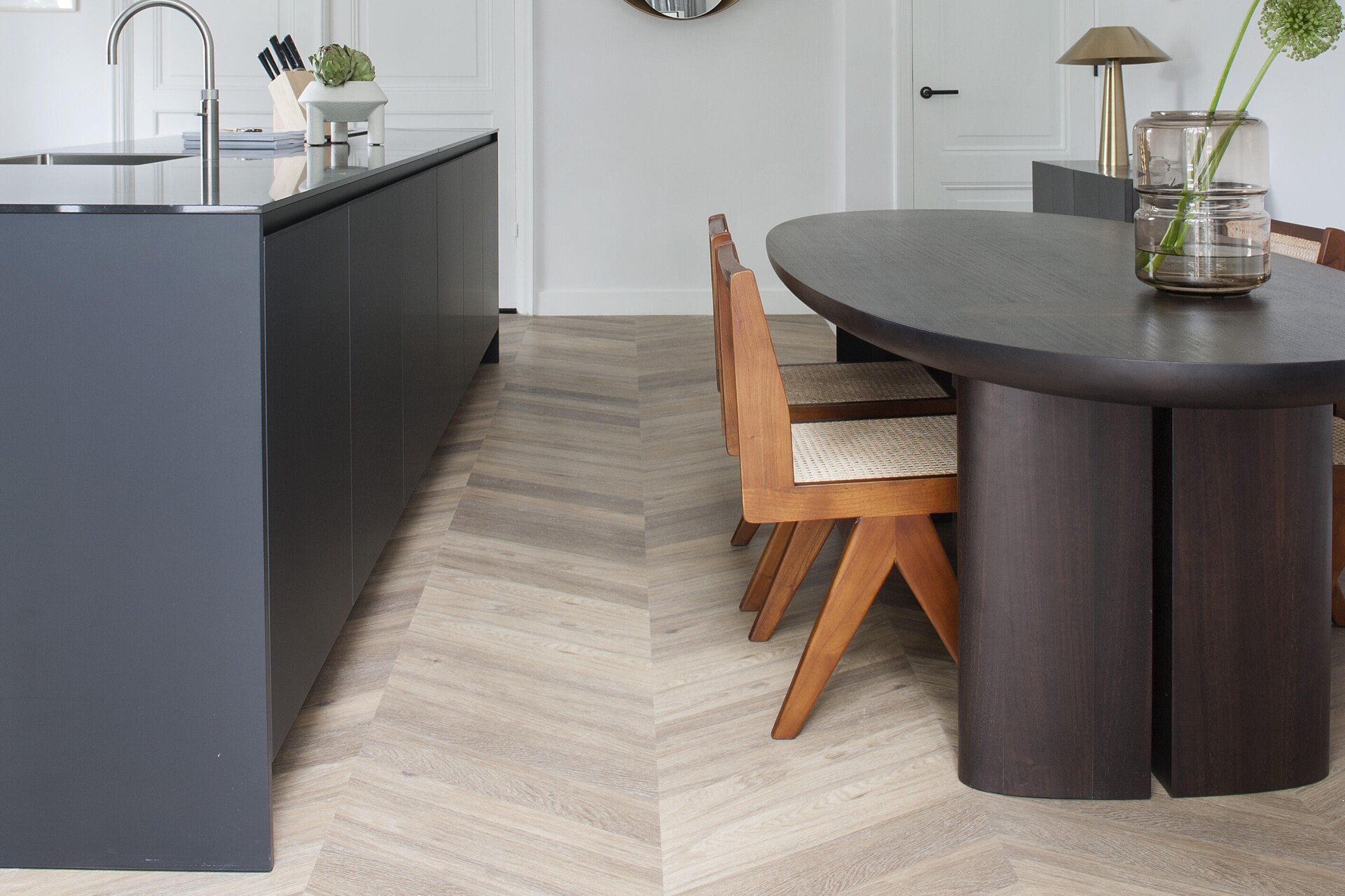 Das Gefühl von Zuhause mit einer eleganten Atmosphäre. Die Innenausstattung des Stadthauses enthält hochwertige Elemente, die zusammen eine luxuriöse Atmosphäre schaffen. Der 6544er Chevron-Boden besticht durch seine warme, dunkle Farbe und seine einzigartige Musterform.