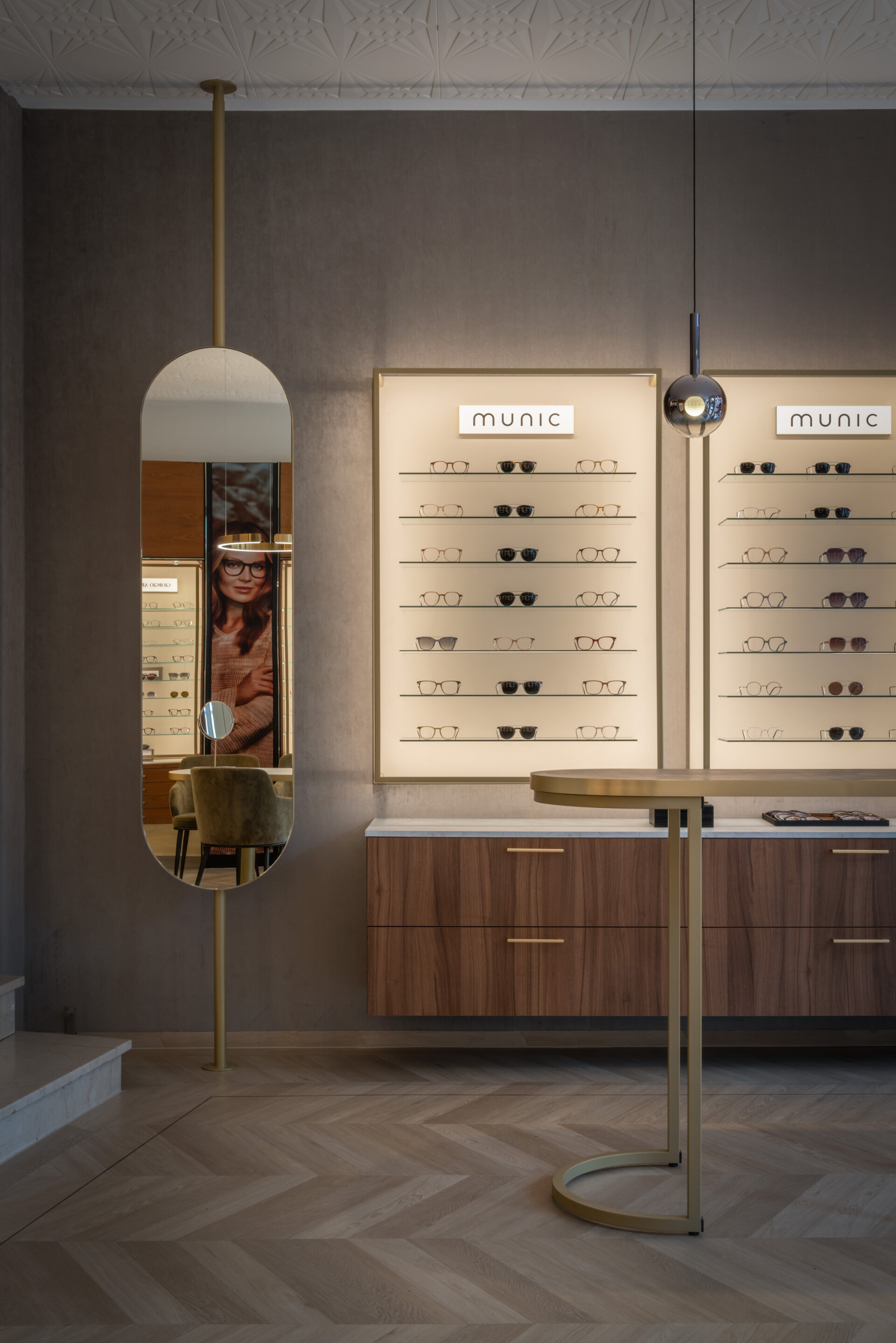 Dieser Optiker in München verfügt über ein erneuertes Interieur mit einer ruhigen und klaren Basis. Maßgefertigte Möbel und eine doordachte Aufteilung sorgen für Übersicht und lassen die Kollektion gut zur Geltung kommen.