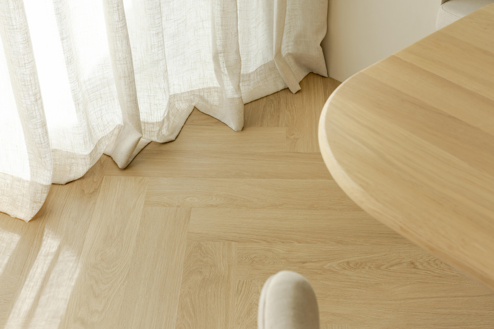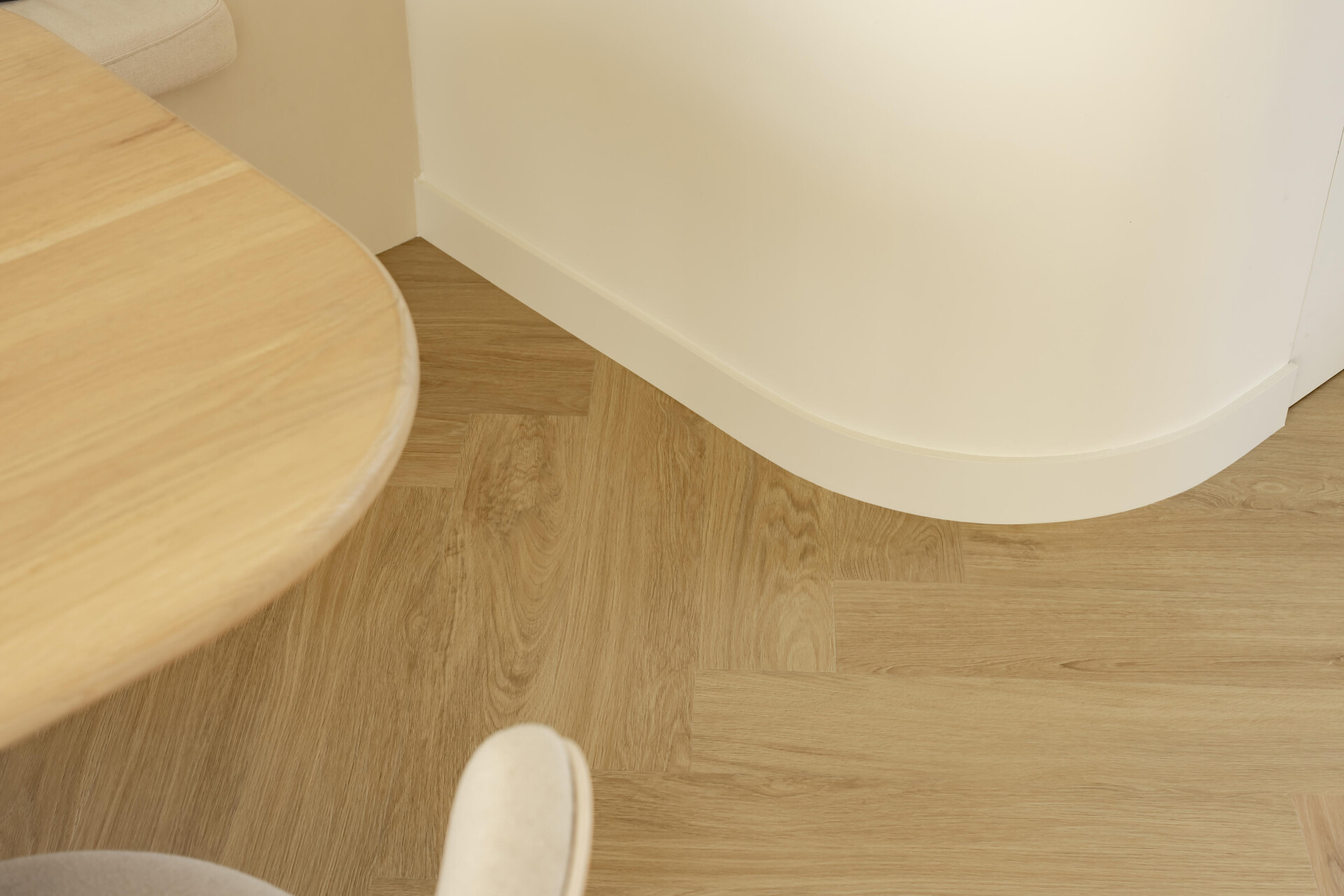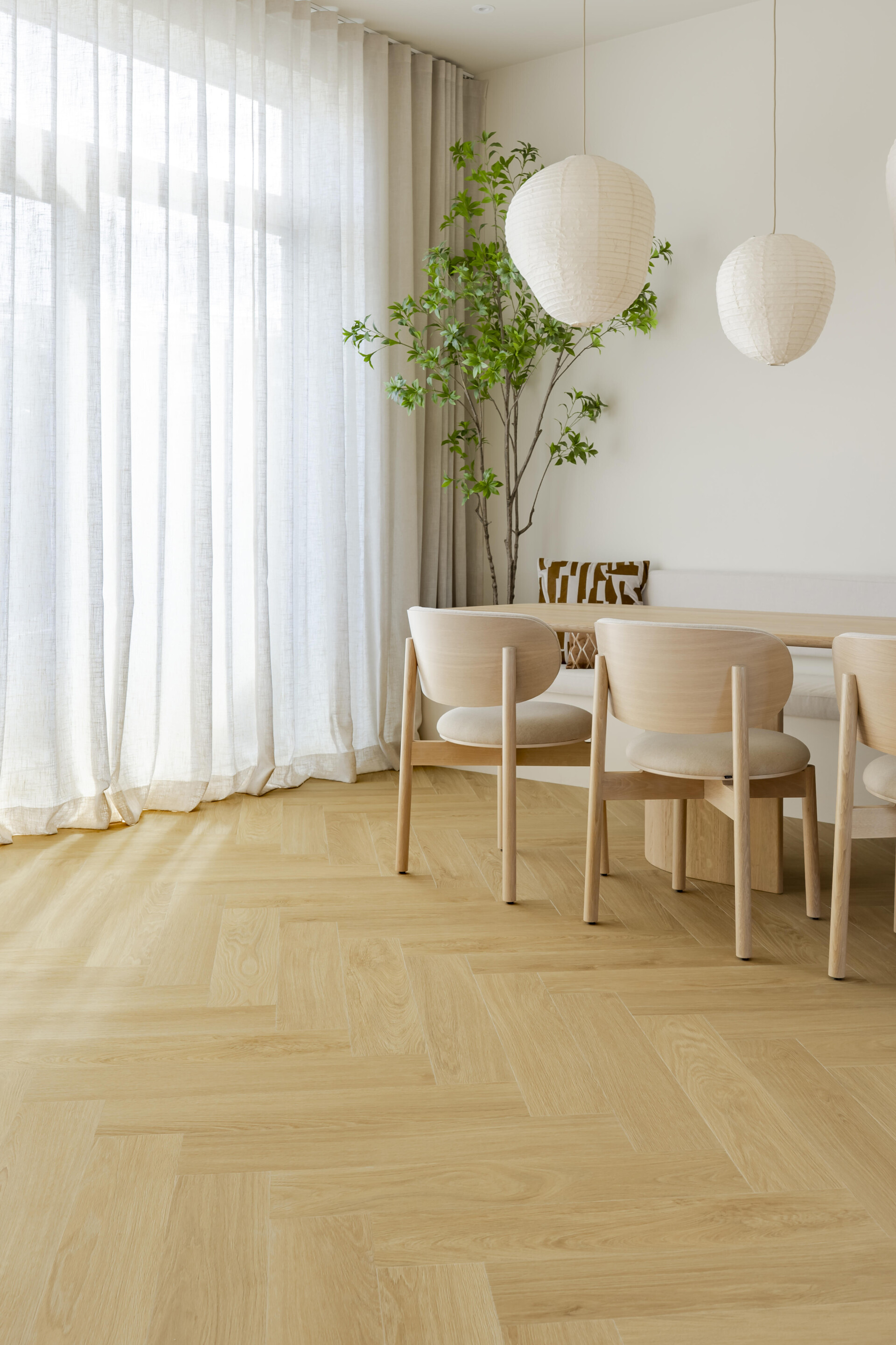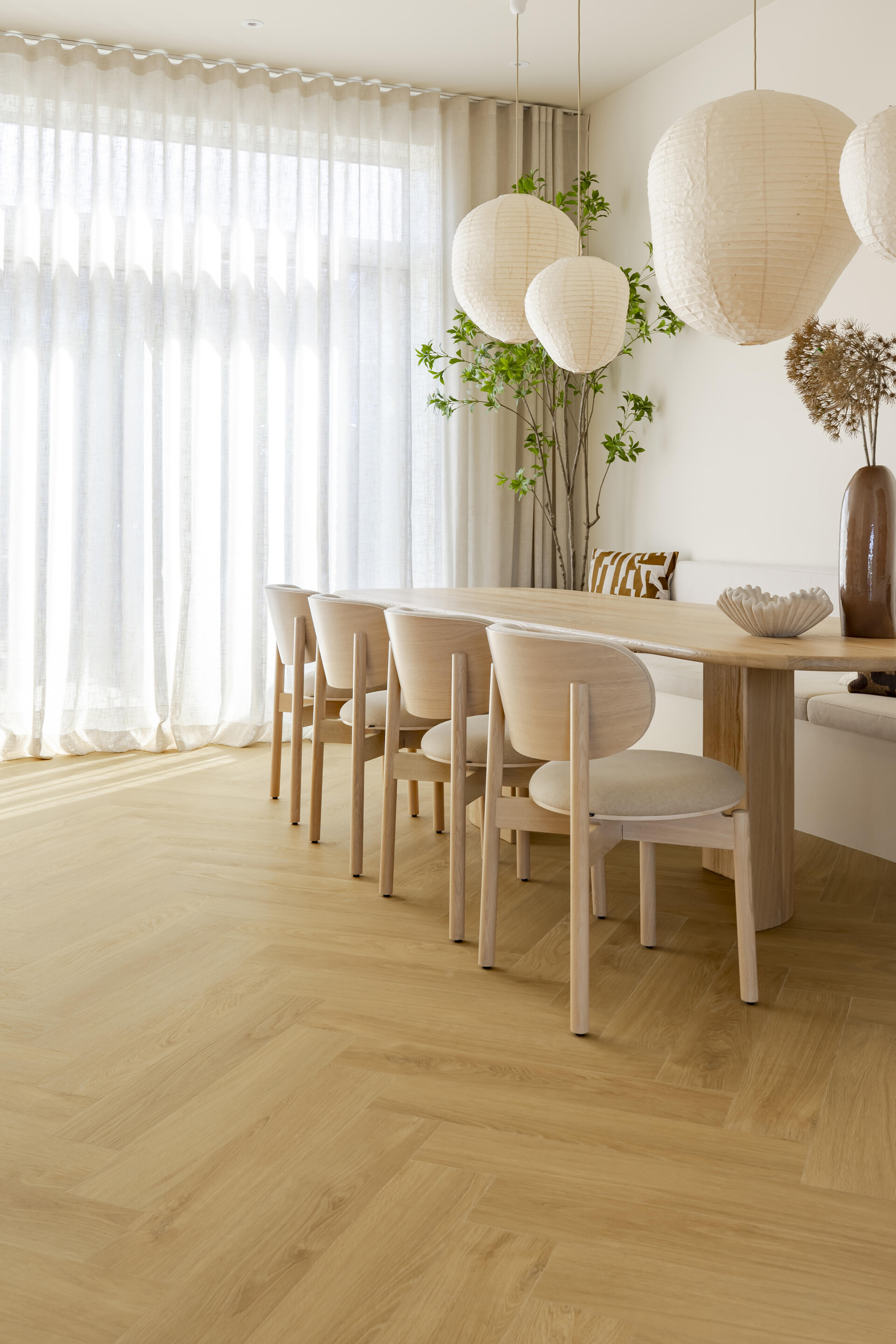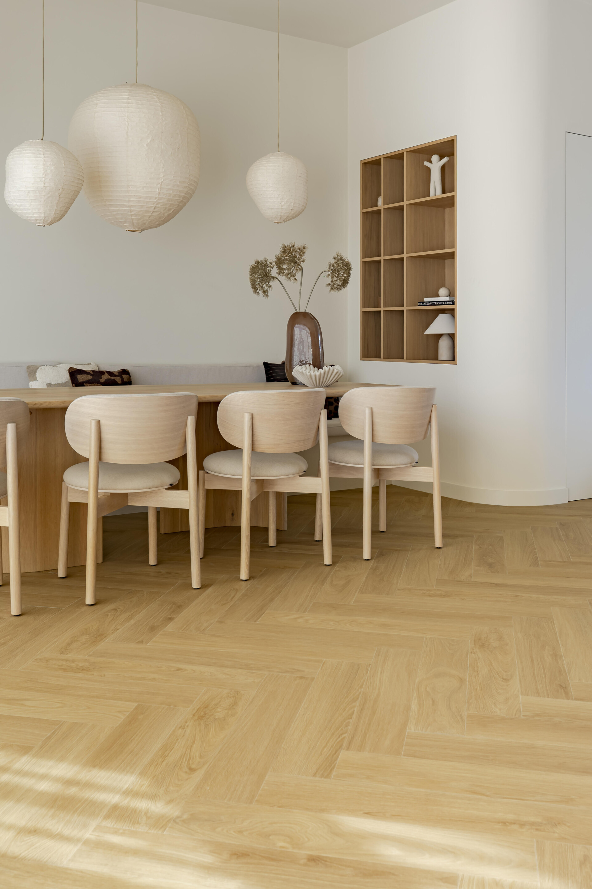 In diesem Essbereich wurde die 7523 aus der Classic Serie gewählt. Das Eichendekor kommt im Fischgrätmuster zur Geltung und gibt der offenen Raumaufteilung Struktur. Die Holzzeichnung und die subtilen Fugen sorgen für Struktur und Tiefe.