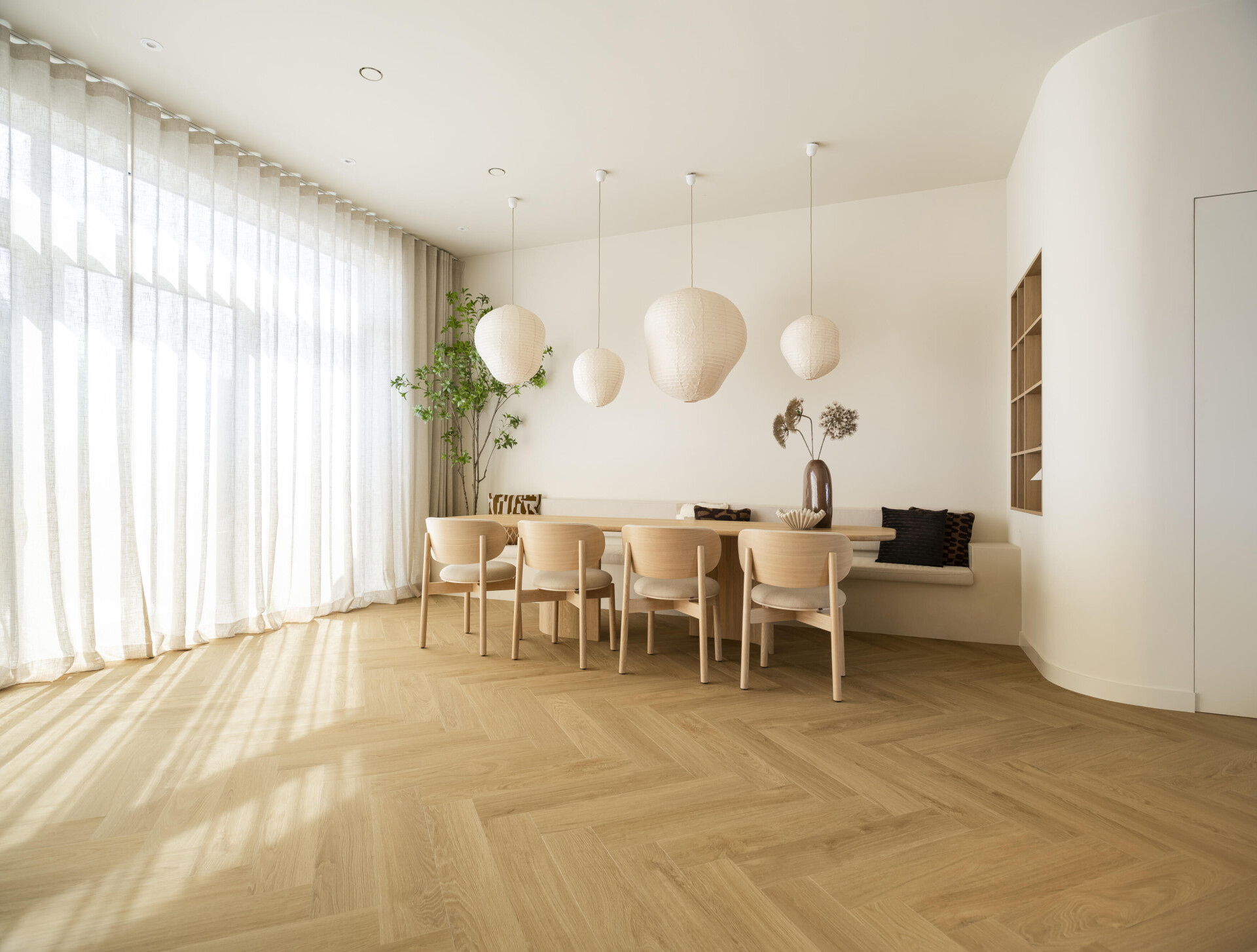 Die Farbe passt zu den Wänden, dem Holztisch und der fest eingebauten Bank entlang der Wand. In Kombination mit der Polsterung, dem Wandmöbel und den Fensterflächen entsteht ein stimmiges Gesamtbild, in dem Boden und Einrichtung aufeinander abgestimmt sind. Dank des Doppeldesigns und der Variation in den Fugen wirkt der Boden natürlich und behält seine Ausstrahlung.