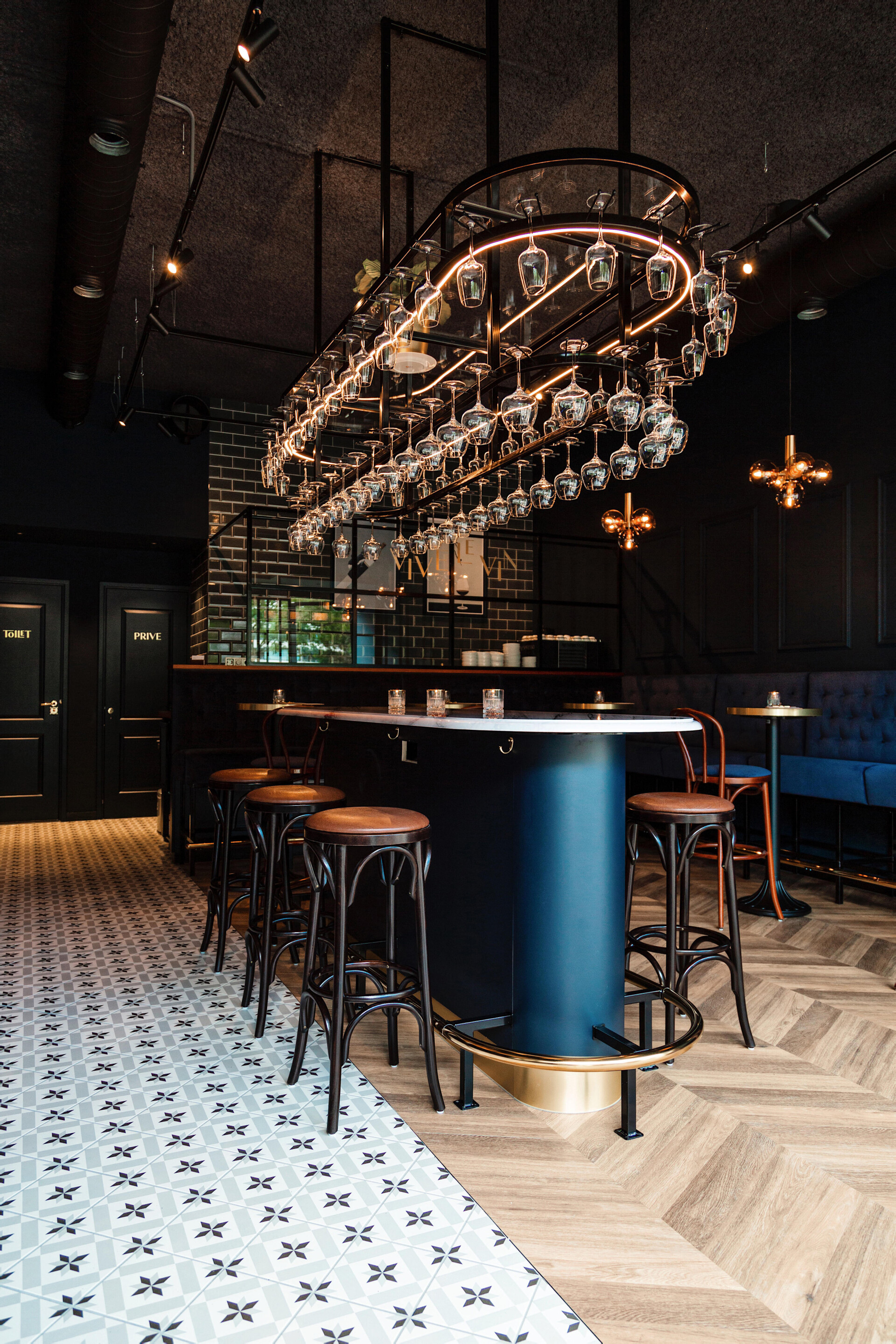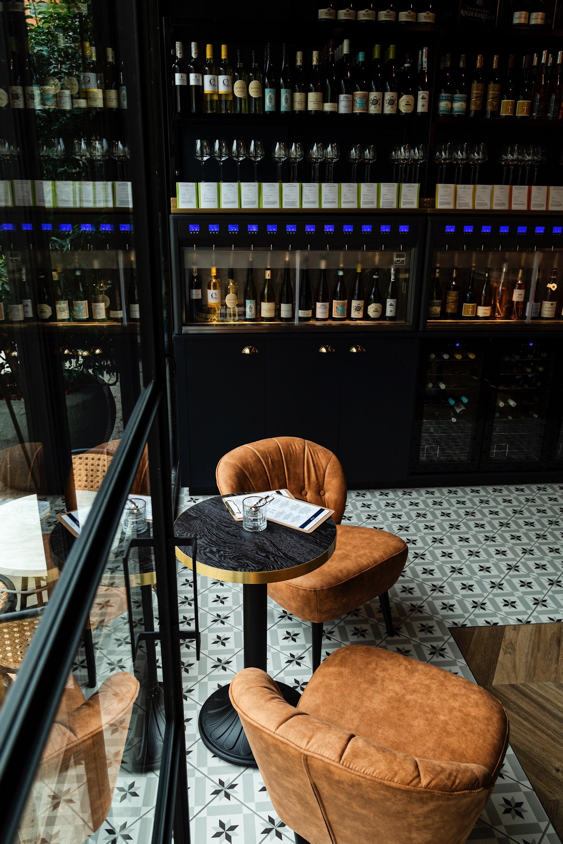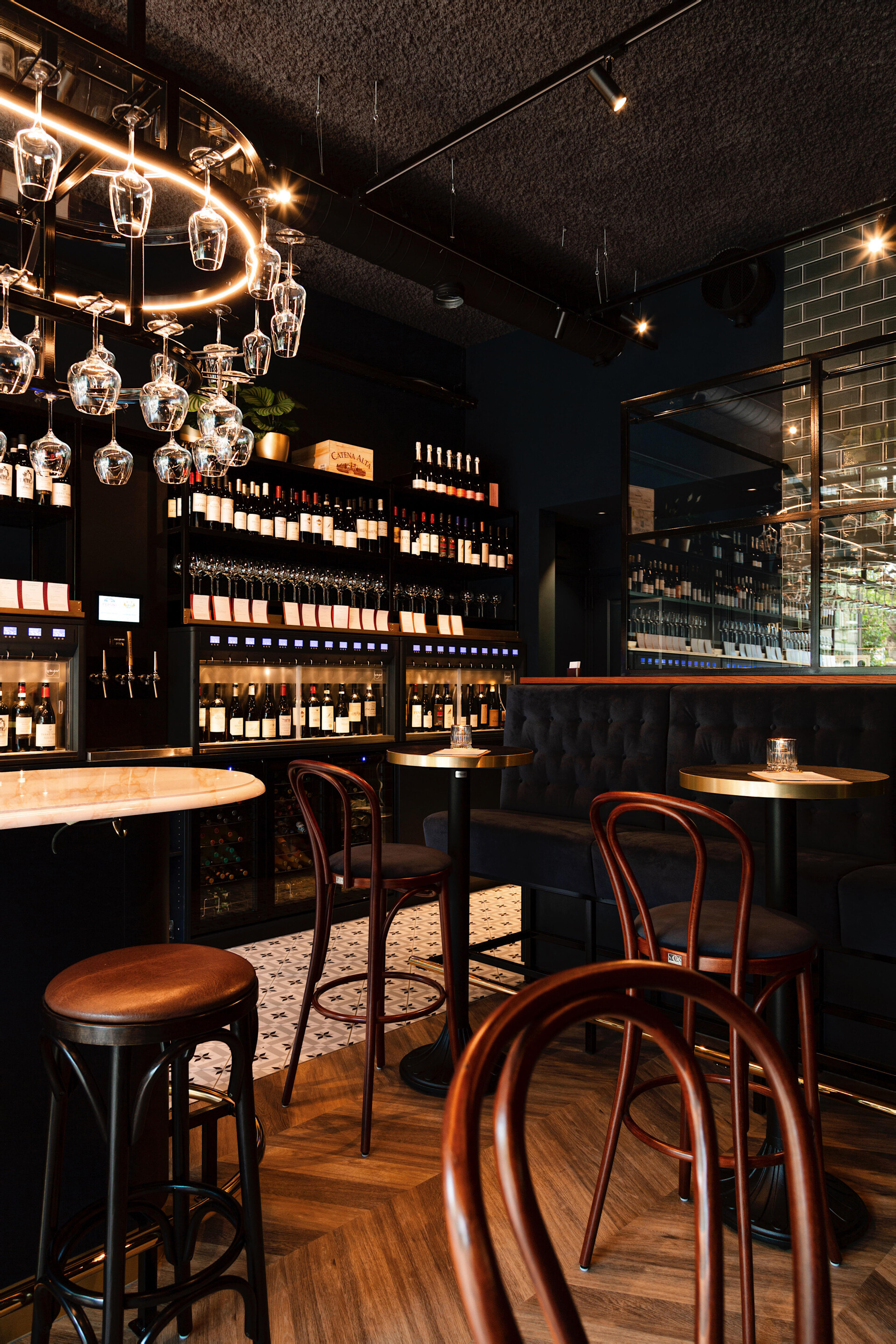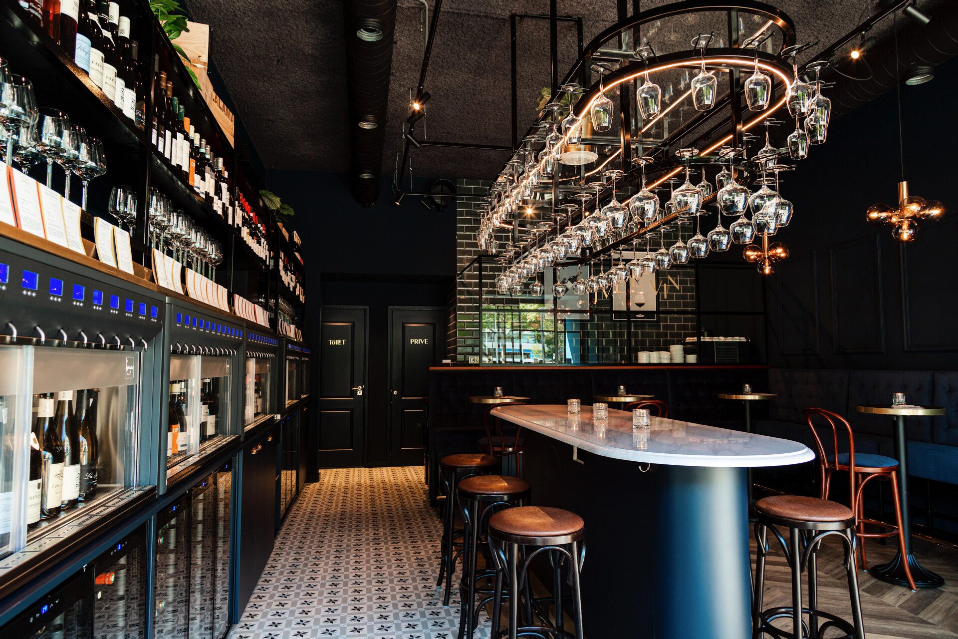 Dieses Erlebnis wird durch das schöne Interieur dieser Weinbar unterstützt. Es wurden dunkle Töne gewählt, die ein stimmungsvolles Ganzes ergeben. Die dunkle ungarische Eiche fügt sich in den Rest des sorgfältig gestalteten Projekts ein. Dies wurde von Horecasfeermakers gemacht.