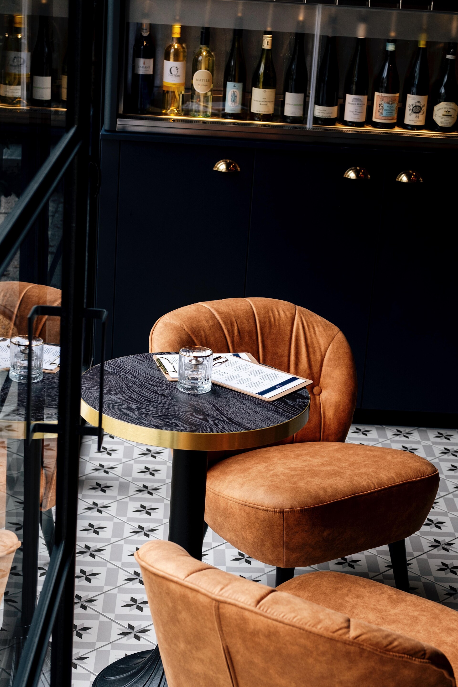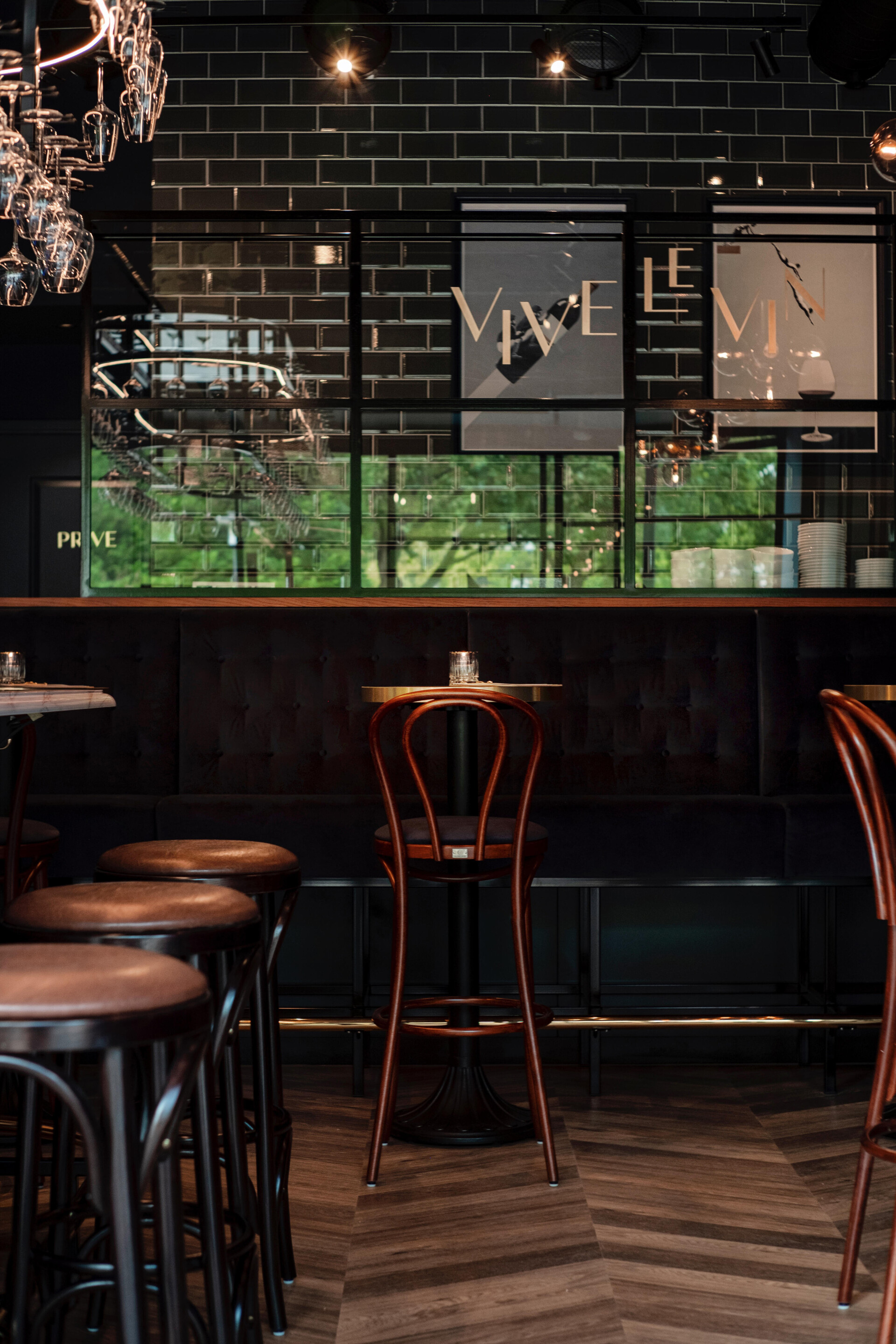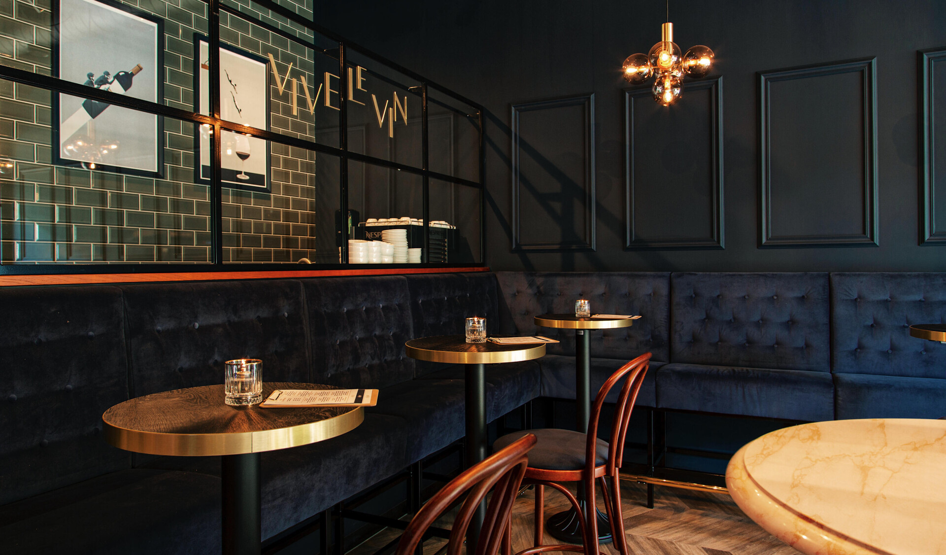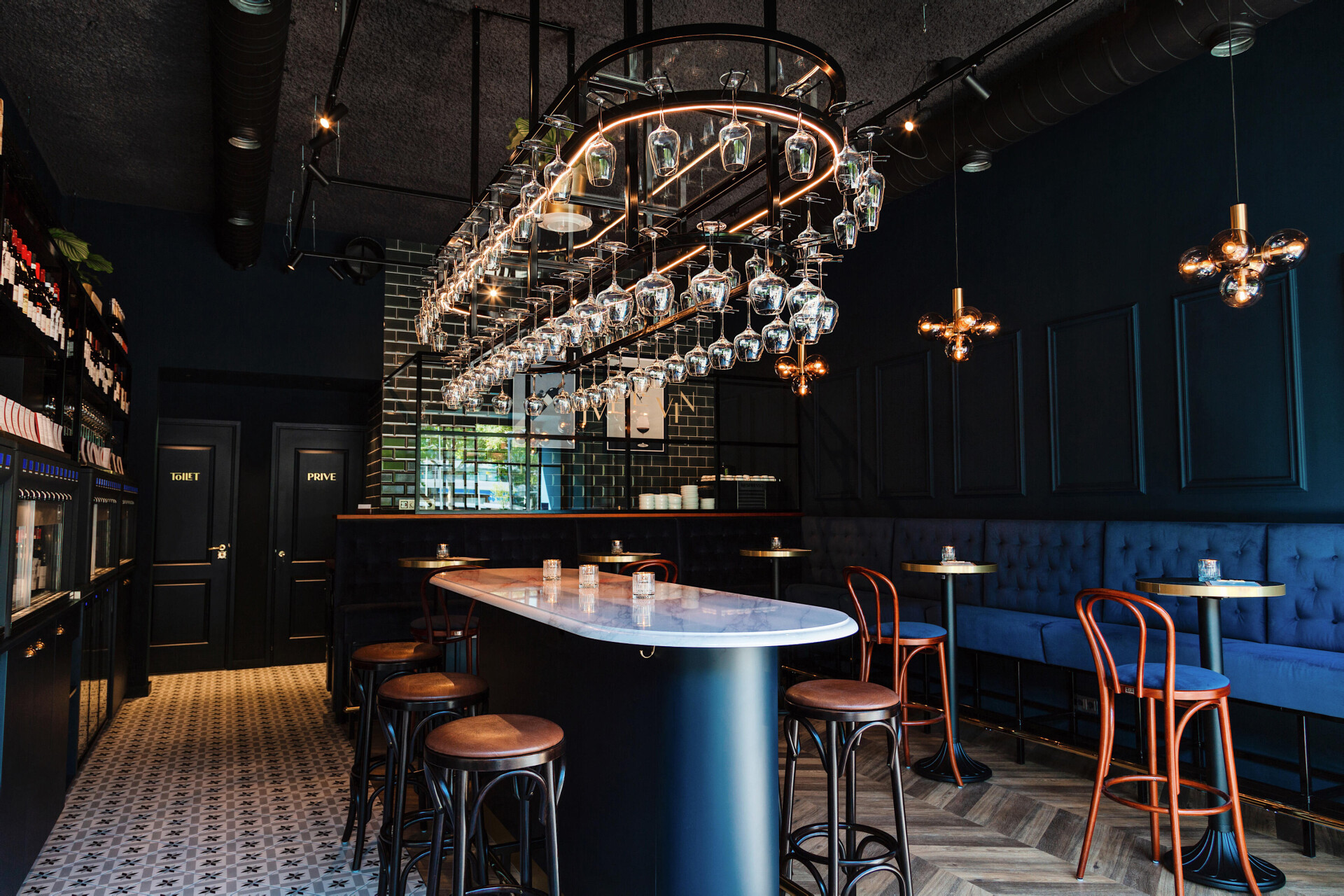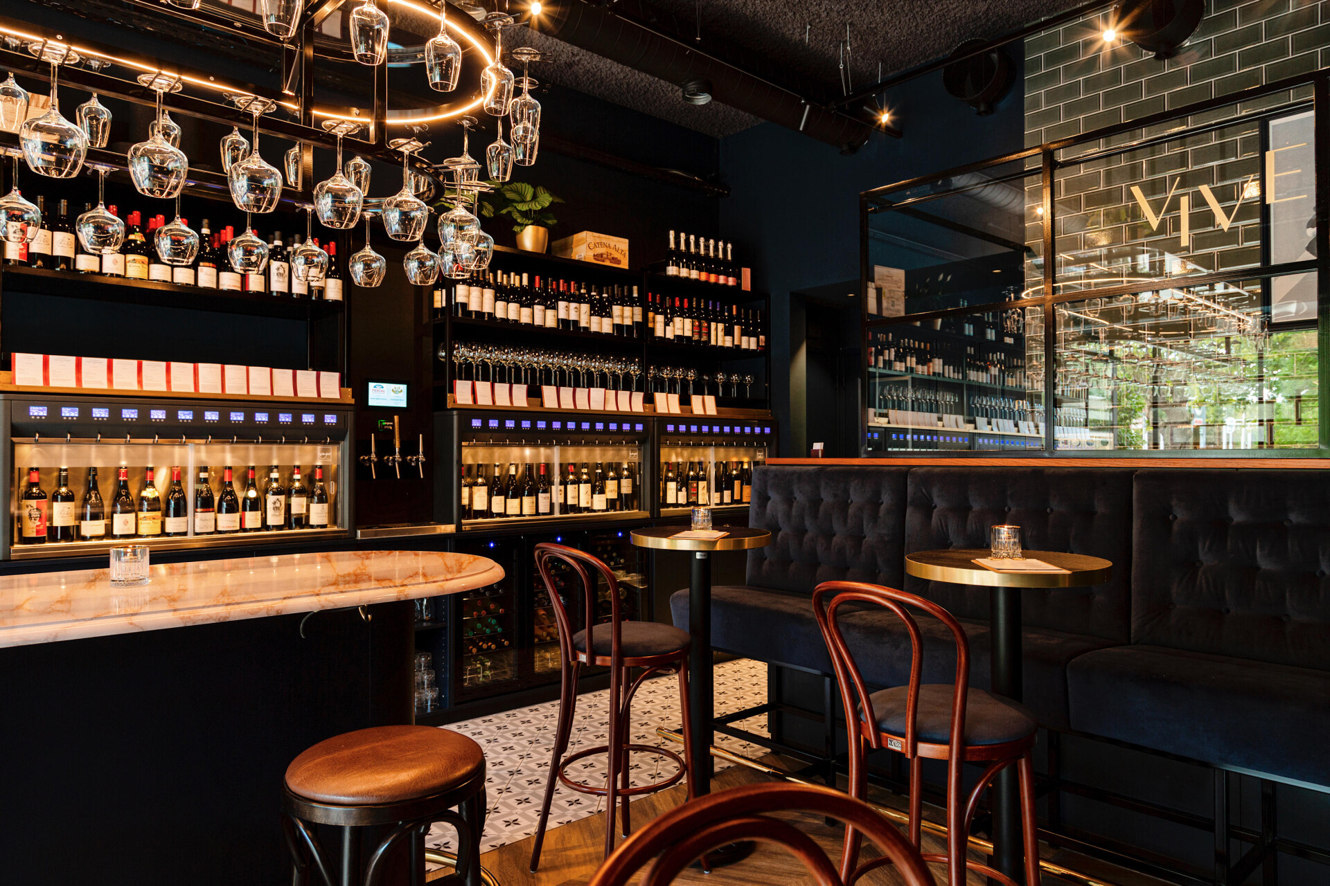 Dieses Erlebnis wird durch das schöne Interieur dieser Weinbar unterstützt. Es wurden dunkle Töne gewählt, die ein stimmungsvolles Ganzes ergeben. Die dunkle ungarische Eiche fügt sich in den Rest des sorgfältig gestalteten Projekts ein. Dies wurde von Horecasfeermakers gemacht.